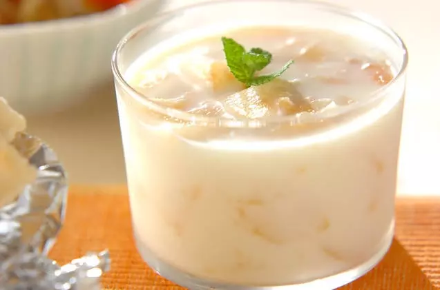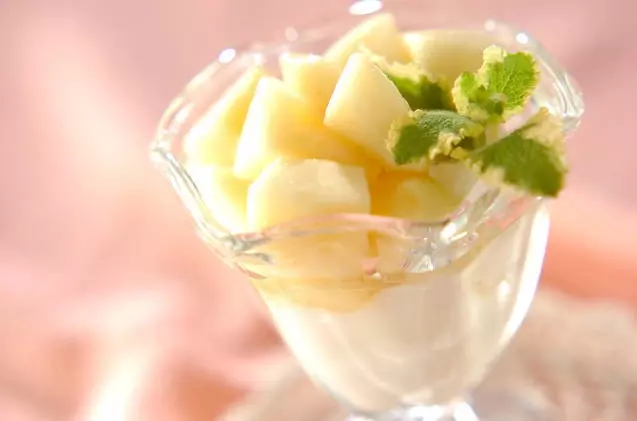 手順2:鍋底を氷水にあて、混ぜながらトロミがつくまで冷やす。トロミがついたら桃を加えてひと混ぜし、器に流し入れて冷蔵庫で冷やし固める。固まったらミントの葉を添える