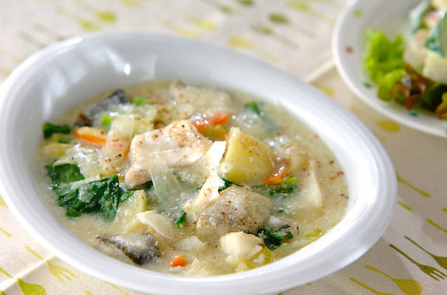 タラは水洗いして水気を拭き取り、1切れを2~3つに切り塩と白ワインを振り掛ける。白菜は1枚ずつはがして水洗いし、幅の広い物は縦半分に切り、葉は3cm幅位のザク切りに、軸は削ぎ切りにする。ジャガイモは皮をむき、1個は4~6つに切り、もう1個はすりおろす。