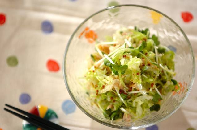 手順1:白菜、貝われ菜、ツナを混ぜ合わせて器に盛り、<ドレッシング>をかける