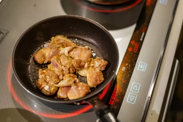 - フライパンで鶏肉を焼き、焼き色がついたら皿に取り出します。