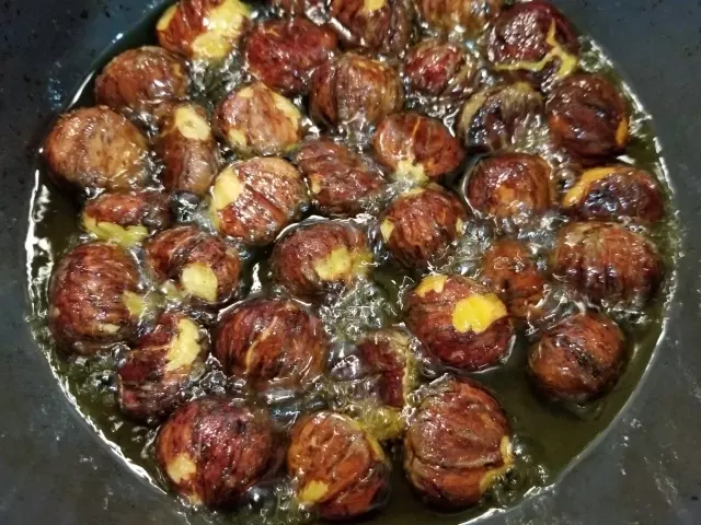 鉄製のフライパンに栗を入れて、水を栗の先端が出るくらいまで水を入れます。ふたをして中〜強火で10分程蒸してパチパチと音が鳴りだしたら、ふたをしたまま3分程フライパンを揺すって炒ります。取り出して熱を冷ましたら、とても簡単に鬼皮が剥けます。あまりに冷えすぎると剥きにくくなるので気をつけてください。
