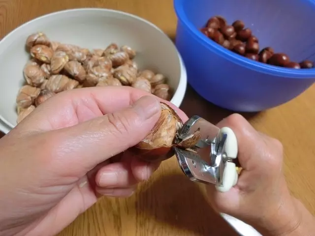100均などで鬼皮と渋皮をいっしょに剥ける便利な専用ハサミが販売されています。ノコギリ型の刃とハサミのような刃とで栗を挟むと、力を入れずともとても簡単に皮が剥けます。包丁が苦手な人にはおすすめです。