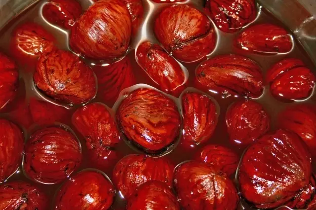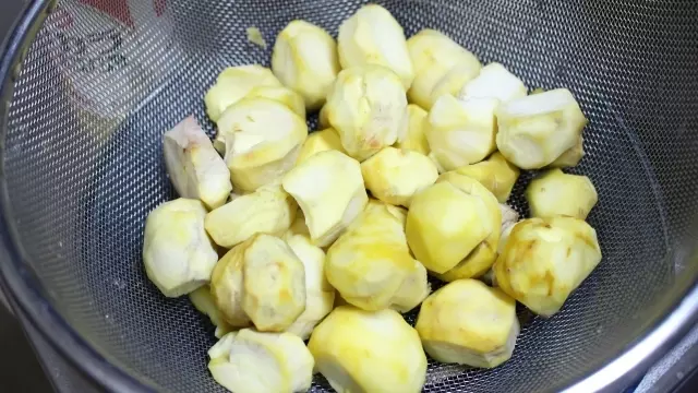 鬼皮を剥いても渋皮が残っていて、そのままでは渋みが残ります。特に渋皮煮を作る際には、この渋みがあだとなります。ゆえに鬼皮を剥いたら水に2~3時間漬けてアクをしっかりとりましょう。