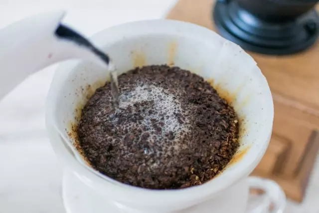 ドリップすると、コーヒーの粉は泡が立ちもこもこと膨らんでくるのですが、鮮度が落ちると膨らまない状態になってしまいます。お湯を注いだときに、粉が膨らんで山状になってくるのが新鮮なコーヒー粉の証拠です。