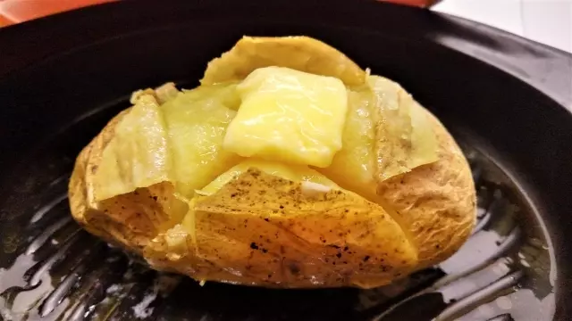 - 竹串などを刺して、スッと通ったら十字に切れ目を入れて、塩を振り、バターを乗せて出来上がりです。