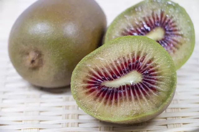 静岡県富士市で選抜育成された、中国系の品種です。小ぶりで産毛がほとんどなく、へたの部分がややくぼんだ形をしています。黄緑色の果肉で、中心部周りの種がある部分は赤みがあるのが特徴です。輪切りにすると緑色と赤色のコントラストがあり、アジアっぽさのある品種ですよ。静岡県の「レインボーキウイ」や「紅鮮」、香川県の「さぬきエンジェルスイート」がこの品種です。糖度17度と酸味はほとんどなく濃い甘さがあります。