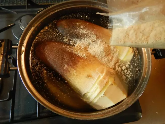 - タカの爪、たっぷりの米のとぎ汁でたけのこを30分程湯がく。