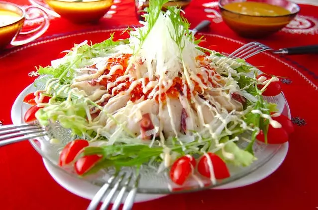 手順4:器にレタス、サラダ水菜を敷き、<ドレッシング>にからめながらホタテ貝柱、ゆでタコ足を並べて玉ネギ、イクラを散らしてプチトマトを添え、全体にマヨネーズを細く絞り出す