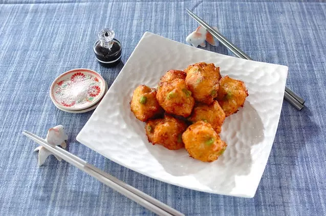 手順3:(2)にホタテ、枝豆、玉ネギ、紅ショウガを加えて混ぜ、 ひとくち大ずつ170℃の揚げ油に入れる。少し揚げ色がついたら油をきり、器に盛る。お好みで分量外のしょうゆや塩を添える