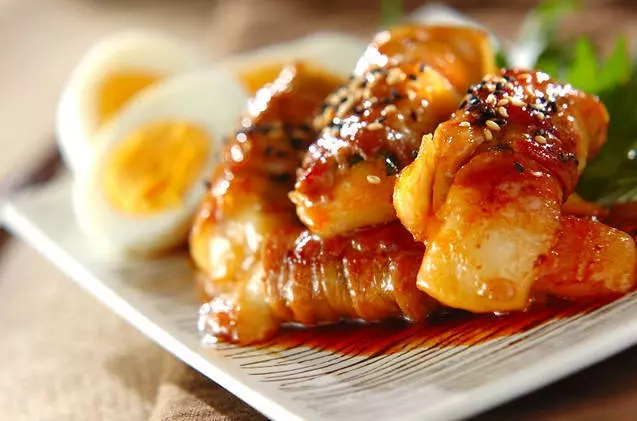 手順1:豚バラ肉を2枚広げ、大葉と角餅をのせて巻く