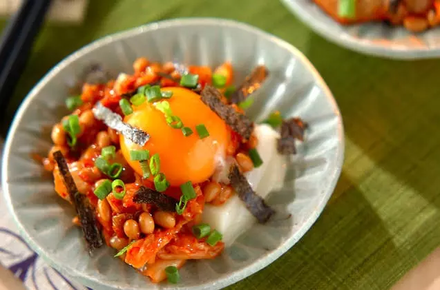 手順2:お餅を器に盛り、混ぜ合わせた白菜キムチと納豆をかける。卵黄をのせて、刻みネギ、もみのりを散らし、しょうゆをかける