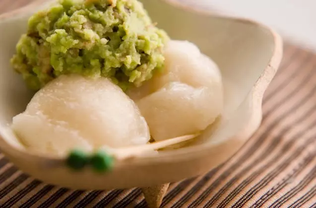 手順3:角餅は水に通して耐熱皿にのせ、ふんわりとラップをして、電子レンジに1分~1分30秒かけて、やわらかくする。水小1を加えて練り全体がまとまれば半分にちぎって丸め、手のひらで少し押さえて平たく形を整えて皿にのせ、2を添える