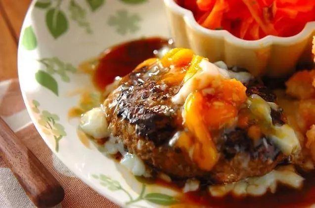 手順2:ハンバーグに(1)をかけて、温泉卵をのせる