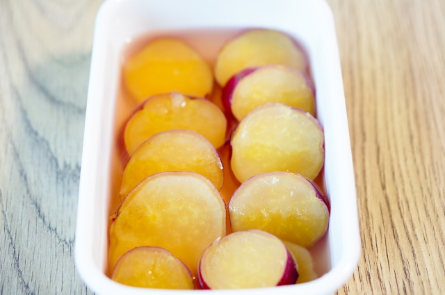 また、さつまいもを洗ってから切ってしまったときの保存方法としては、さつまいもが水に浸るようにして、食品保存容器に入れ冷蔵庫で保存するというものです。水につけておくことで切り口が空気に触れないので、酸化や変色を防ぐ効果があります。