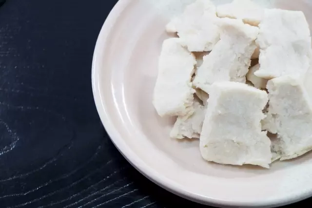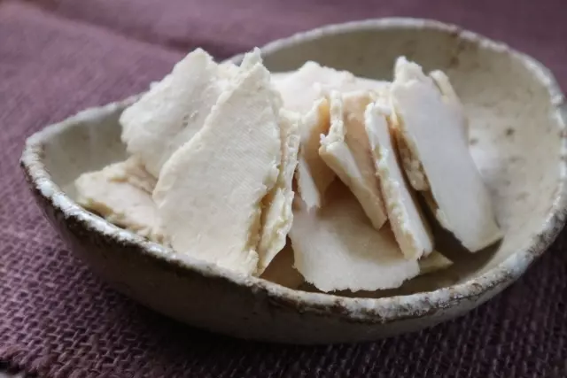酒粕を板状のままで切ったものです。厚みがあって固いので、料理に使うときには少しの時間、水につけて柔らかくする必要があります。色は白っぽいです。
