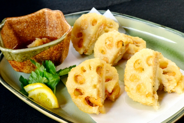 まず、素材が玉ねぎやニンジン、ピーマンのように薄くて火が通りやすいものの場合は、180℃で揚げてください。サツマイモやカボチャ、レンコンのように厚くて火が通りにくい素材の場合は、170℃でじっくり揚げるようにしましょう。