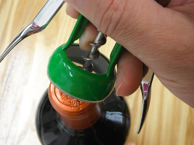 コルク抜き付きの缶切りか栓抜きがあれば、簡単にコルク栓を抜くことができます。スクリューをコルクの真ん中に差し込んで回転させながらしっかりとねじ込みます。そして上に引き上げて、コルクが半分くらい出てきた時点でスクリューを抜いて、あとは指でつまんで引っ張るだけです。