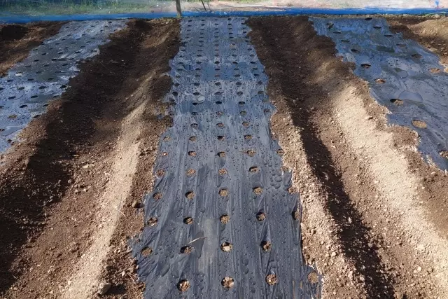 - 化成肥料を施し、高さ30cm、幅60cmの畝を立て、黒マルチを被せ、風で飛ばないように4辺にしっかり土をかぶせます。