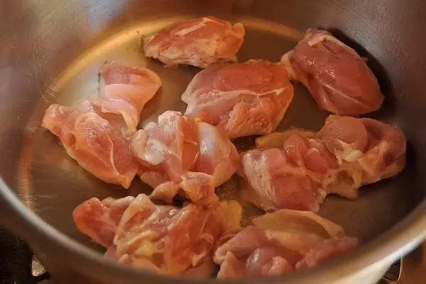 <作り方>1、鍋にサラダ油を強火で熱し、鶏もも肉を皮面を下にして並べ、焼き色がついたら返す。
