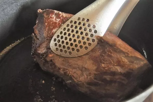 焼き上がりを確認する場合、厚みのある部分に調理温度計を指して約60℃に火が通っていることを確認してください。温度計がない場合は、焼く前にトングで肉を強く挟んで弾力を確認します。焼いた後に再び挟み、弾力に少しかたさが感じられたらOKです。