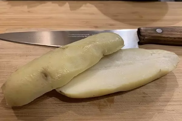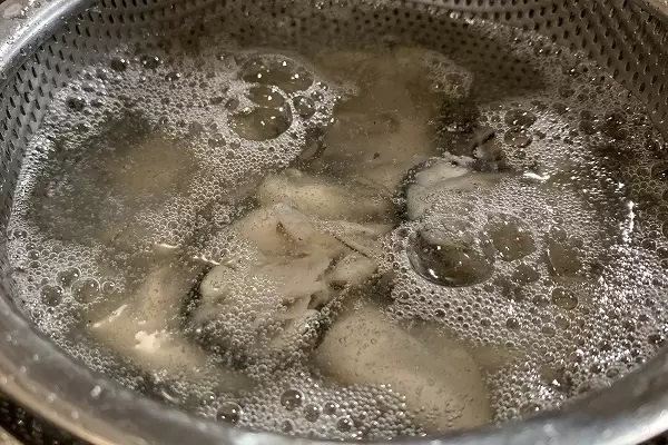 ・「ジャガイモ」を水から茹でます。初めは中火で沸騰したら弱火に落としコトコト茹でましょう。途中で竹串などを刺して「スッ」と真ん中まで刺さったら湯切りして皮を剥きます。水からトータルで20分くらいでしょうか。前もって「茹でジャガ」を仕込んでおくと時短になります。茹でている間にその他の仕込みを進められるので、ジャガイモは1番先に下準備をするのがお勧めです。・「シイタケ」は石づきを落とし、さらに足は根本からカットしてください。今回は傘の部分を使いますので、この美味しそうなお御足は他で使うとします。理由は「カキ」や「ホタテ」よりも食感が残るので、主役の貝類の存在を残したいからです。刻んでチャーハンに入れるもよし、スンドゥブチゲに入れてもよし、シンプルに味噌汁でもよし。結構良いお出汁が出ます。