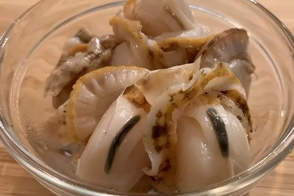 ・「ベビーホタテ」は貝ひも下に黒い汚れが付いています。どうやら排泄物らし。ボイルホタテなので指でつまむと簡単に取れます。貝ひもが嫌いな方は取り除いても構いません。ただしホタテは貝柱ももちろん美味しいですが、この貝ひもに食感と旨味がありますので是非ご一緒に。