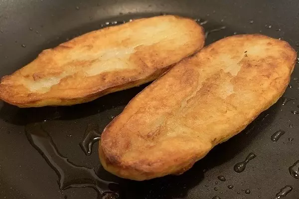 「オリーブ油」を引いたフライパンを中火にし断面から焼いて行きます。きつね色にこんがり色づいたら反対側も焼きましょう。片側は半円形なのでフライパンを少し傾けてフライパンの側面の立ち上がりを使うと良い色に焼きやすいです。