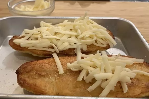 全体がほどよく焼けたらバットに取り出し、平らな面に「シュレッドチーズ」を乗せて160°のオーブントースターで5分焼きます。