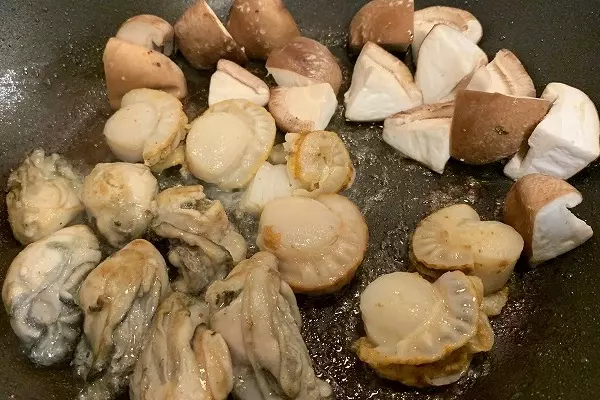 2.「ジャガイモ」を取り出したフライパンに大さじ1のオリーブ油を足して、火の入りの遅い「カキ」から焼いて行きましょう。「カキ」がコロっと膨らんできたら「ベビーホタテ」と「シイタケ」も投入します。「シイタケ」に火が入れば完成です。