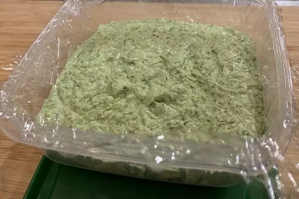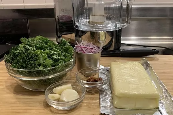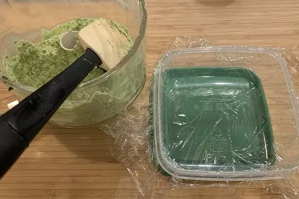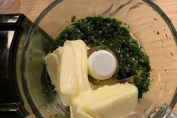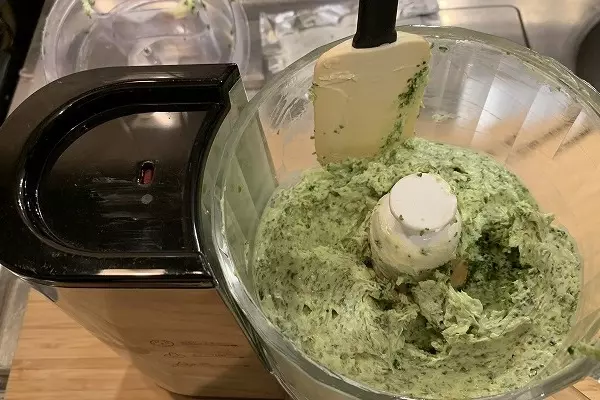 3.<ブルギニヨンバター>は火を入れすぎるとせっかくのパセリの色と香りが飛んでしまいます。ミルクパンやソースパンでゆっくり溶かすのがベストですが、無ければ耐熱容器に入れて電子レンジへ。溶かしたバターと材料をフードプロセッサーに入れ、パセリの緑が全体にゆきわたるまで回し、保存容器に移します。