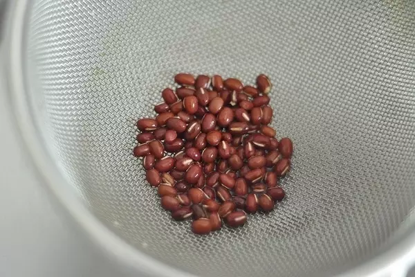 <作り方>1、小鍋に小豆を入れ、分量外の水をかぶる位まで注いで強火にかける。煮たったら中火で5分ゆでてザルに上げる(渋きり)。