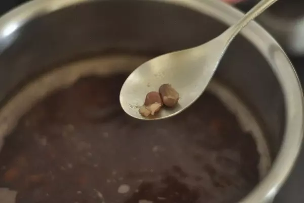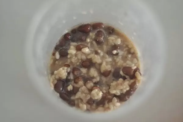 3、小豆をザルに上げてゆで汁と分け、ゆで汁は分量外の水を足して400mlに調節にして発酵食メーカーの専用容器に入れ、米麹と小豆を加える。