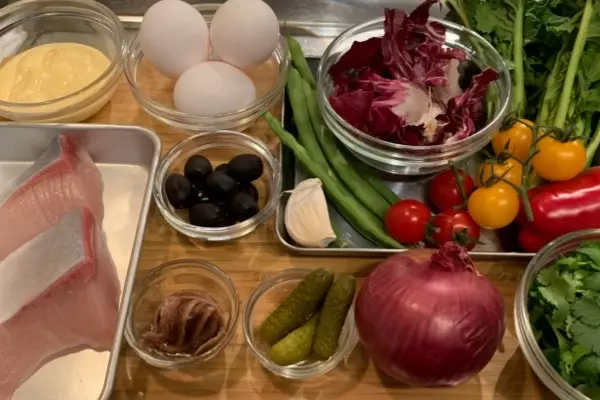 食材に関してもイタリア共通の物が多く見られます。特に「サラダ・ニソワーズ」に関していえば「ツナ」を使用することが特徴で、その他にはトマト、オリーブ、ニンニク、アンチョビ、ハーブ類、またインゲン、茹でたジャガイモ、ゆで卵なとが定番的で定義的な食材です。