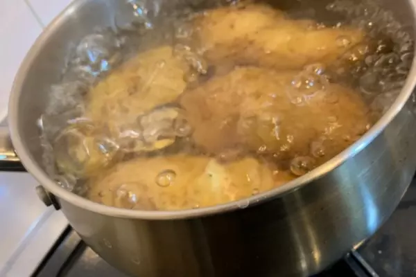 優しく投入しないと鍋底に卵がヒットして殻が割れてしまいます。そうなるとそこから白身が滲みますので、茹で上がりを剥いたときに筋が入ってしまったりと、キレイなむき卵にならなくなってしまいます。投入時は特に優しくしてあげてください。