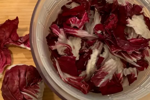 ・「トレビス」は一口大にちぎって浄水に晒します。クタっと萎びたところがなくなり全体にパリッとしてきたら水から引き上げます。サラダドライヤーでしっかり水気を切ったら、底にペーパータオルを引いたタッパーで保存しましょう。