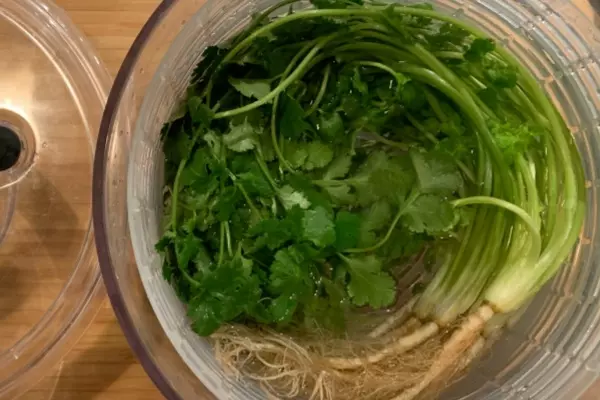 ・「パクチー」は束を解いてカットせずにそのまま浄水で戻します。枝がピンと立ってきて水面から飛び出すようになってきたら引き上げのサインです。こちらもサラダドライヤーでしっかりと水気を切り、ひとまずはペーパータオルとタッパーで保存しましょう。他の火を使う下順備が一通り終わったところで、場所を確保し野菜のカットを始めます。