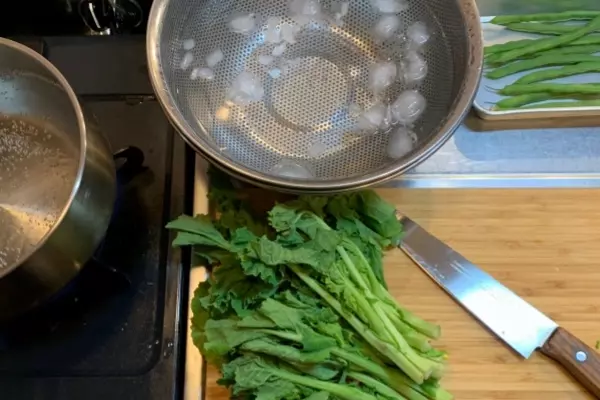 茹で野菜はすぐに冷まさないと綺麗な緑色が濁って行きます。お湯に野菜を投入してからでは遅すぎるのであらかじめ用意しておきましょう。