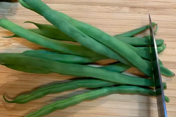 ・「インゲン」は下の方をまとめて持ち、軽くまな板に叩きつけながら端を揃えます。揃ったところでまとめてヘタをカットしてください。先端の細いところは残します。必ず沸騰したお湯で茹でましょう。硬さはお好みですが30秒程で茹で上がります。引き上げたらすぐに氷水で冷やします。