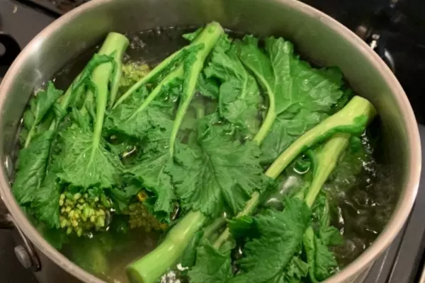 「菜の花」は「インゲン」などに比べて質量が大きいので、たっぷりのお湯でしっかりと沸いた状態で湯がいてください。また葉が広がり、茎も太く投入直後に一瞬温度が下がります。お湯の中でも温度に差が出ますので、葉をいたわりながら菜箸などで優しく撹拌してあげてください。こちらは20秒ほどで茹で上がります。予熱も考慮に入れながら、サイズが小さければそれだけ早く氷水に引き上げましょう。