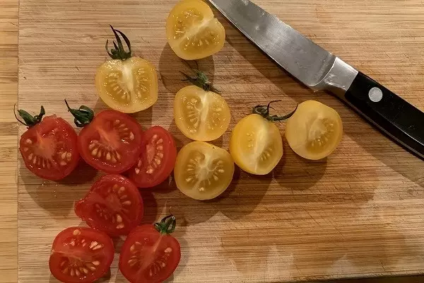 ※茹でものが一通り終わりましたら、調理器具もそこそこ多いので一旦片付けをして、スペースを確保します。有効な空間を確保してからまな板を広げてください。ここからカットに入ります。・「トマト」も枝ごとしばらく水に晒しておくと瑞々しさが持続します。カットは縦半分に。
