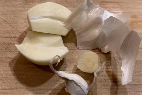 ・「ラディッシュ」も浄水に晒します。もし表面が萎びていても硬さが戻りシャキッとします。カットは薄すぎると食感がなくなり面白くないので、2mmほどの厚さでスライスを。・「ニンニク」は上下を落とし皮を剥き、半分にして芯を取り除いておきます。