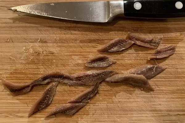・「アンチョビ」は1フィレを斜めに3等分に。大きものは4等分にカットしておきます。盛り付け時にジャガイモの上に載せます。