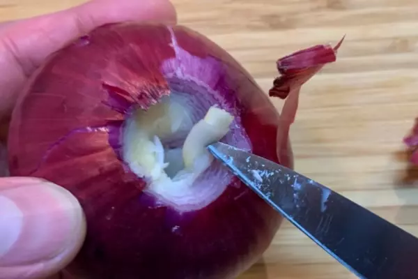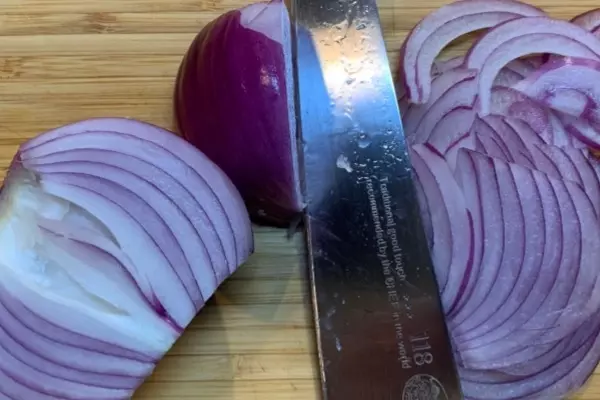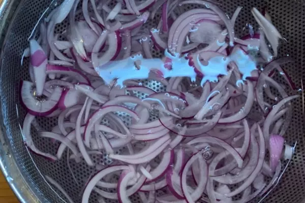 ・「赤玉ネギ」をスライスして行きます。まずヘタをペティナイフの先端でくりぬき、中に見える芯をペティを使ってほじくり出します。イメージとしては芯に刺して持ち上げる感覚です。これは普通の玉ネギでも同じ作業をします。スライスしてしまってからでは芯を取り除きにくいからです。初めに取ってしまいましょう。芯が取れたら繊維に沿ってスライスします。そしてザルボウルを用意して、浄水につけて辛味をとって行きます。