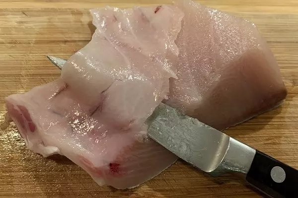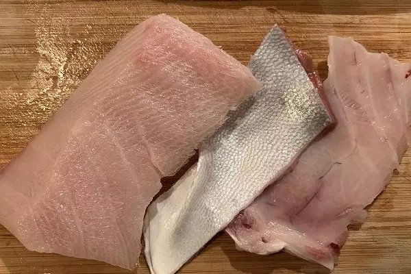 ・いよいよ「寒ブリ」です。内臓側の膜と、その下に骨が残っていたら包丁で削ぎ落とします。また皮も下にして身との間に包丁を入れ、皮を引っ張りながら左右に揺するとキレイに皮を剥ぐことができます。続いて「アセゾネ」をして「パネ」します。※下記解説参照