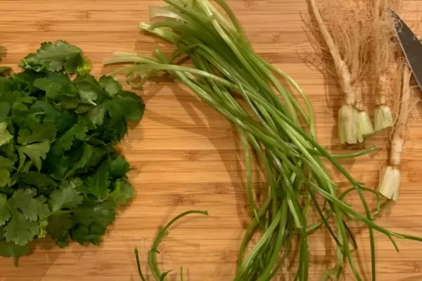 1.「パクチー」は葉の部分を茎からちぎって、まとめておきます。後ほど葉の部分を「マヨネーズ」と一緒にブレンダーにかけます。
