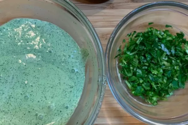 6.それではカットした材料合わせて行きましょう。まずはベースの「パクチーマヨネーズ」を作ります。ブレンダーを用意して、少し深めの容器に「マヨネーズ」と「パクチー」の葉を入れ、ブレンダーをかけます。あらかじめ「マヨネーズ」の計量をこの時点で使う容器で用意しておくと便利です。おそらくブレンダーを4、5回上下させる程度で滑らかに混ざり合うと思います。