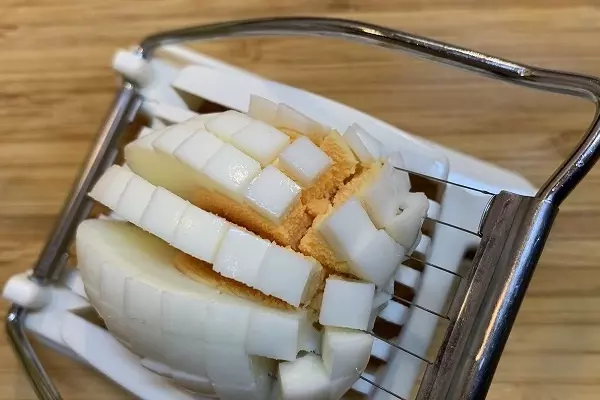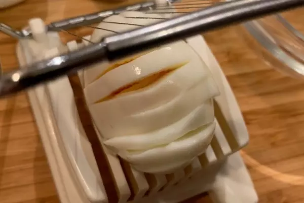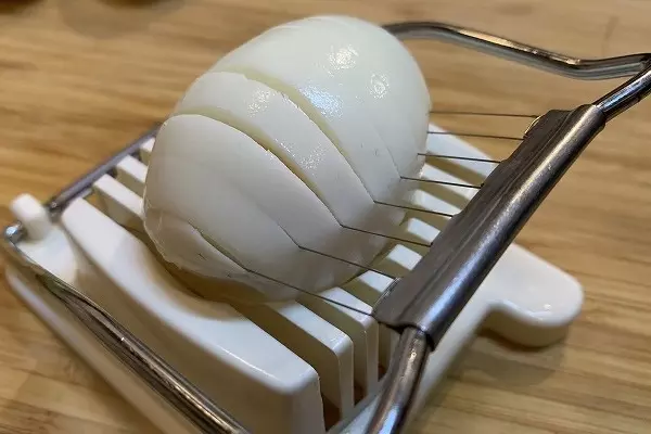 2.「ゆで卵」は殻からむいてエッグスライサーにかけます。まずは横向きにスライスして、その後で90度回転させ、縦にも刃を入れます。3mm角の状態になったと思います。こちらは最後にマヨネーズに合わせますので、器に取り分けておいてください。