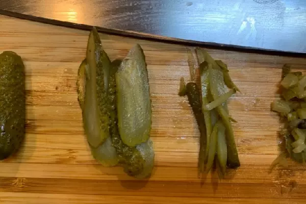 3.「コルニッション」(ピクルス)はカットした卵と同じ大きさに仕上げたいです。包丁で均等にスライスして、スライスをさらにせん切りにします。最後にサイの目にカットしてください。水気が出るようならペーパーでオフしておきます。
