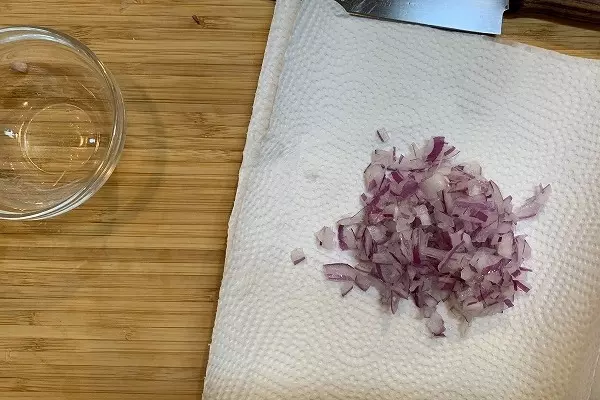 5.先ほどスライスした「赤玉ネギ」もみじん切りにして、一度ペーパーに包み、軽く絞ります。