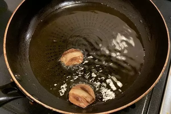 黄身が半熟すぎると、味が薄くなりやすいですし、黄身の色がソースに混ざってしまいます。また固茹での方が冷ました時に卵の香りがよく出ます。プリッとした食感も得られるためにあえて今回は固茹でにして美味しいソースに仕上げます。8.「パネした寒ブリ」をパン粉焼きにして行きます。オリーブオイルを鍋に入れ、中火にかけます。温度が上がる前にニンニクを入れてください。高温の状態でニンニクを入れると、オリーブオイルに香りが移る前にニンニクが焦げてしまいます。あくまでゆっくり香り付けを。程よく色づいてきたら器に取り出し、軽く塩を振ってください。後で一緒にサラダに盛り付けます。このニンニクがとても美味しいんです。